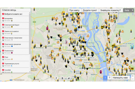 Видання «Велика Епоха» розробило всеукраїнський сервіс інтерактивних мап «Куди здати відходи». У ньому можна вибрати мапу, де позначено пункти прийому різних видів відходів.